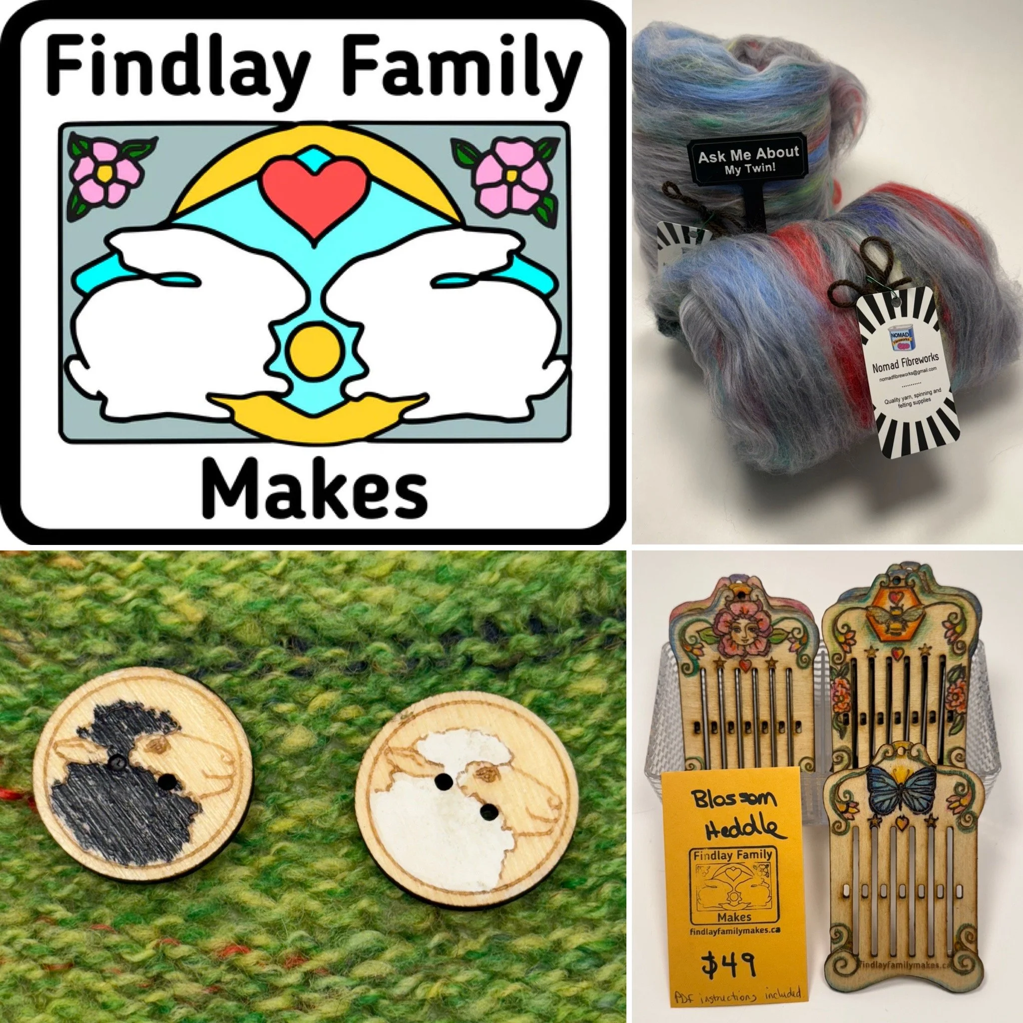 Findlay Family Makes has beautifully crafted artful wooden buttons, Blossom weaving heddles, handspun yarns, colourful carded batts and thoughtfully written books co-created by Noreen Crone-Findlay, Alliston Findlay, Angus Findlay and Chloe Findlay-Harder in Edmonton, AB.